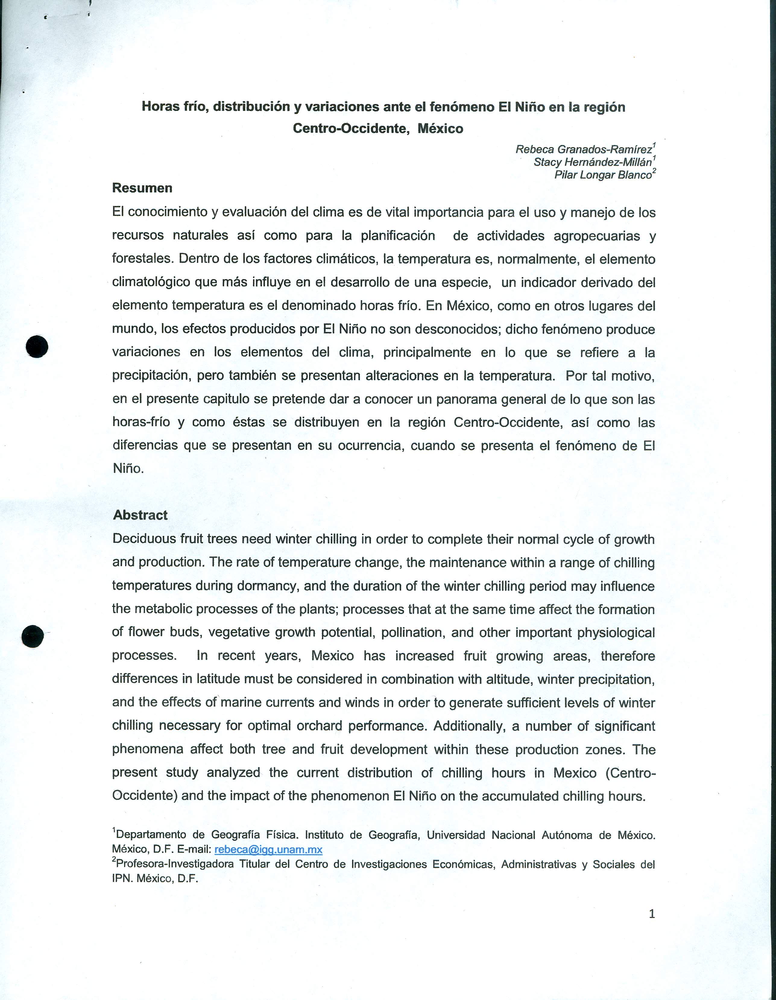 Título : Horas Frío, distribución y variaciones ante el fenómeno del Niño en la región Centro-Occidente, México